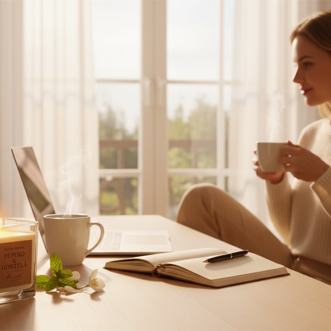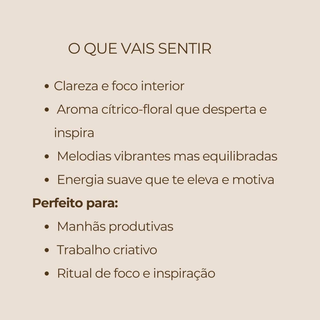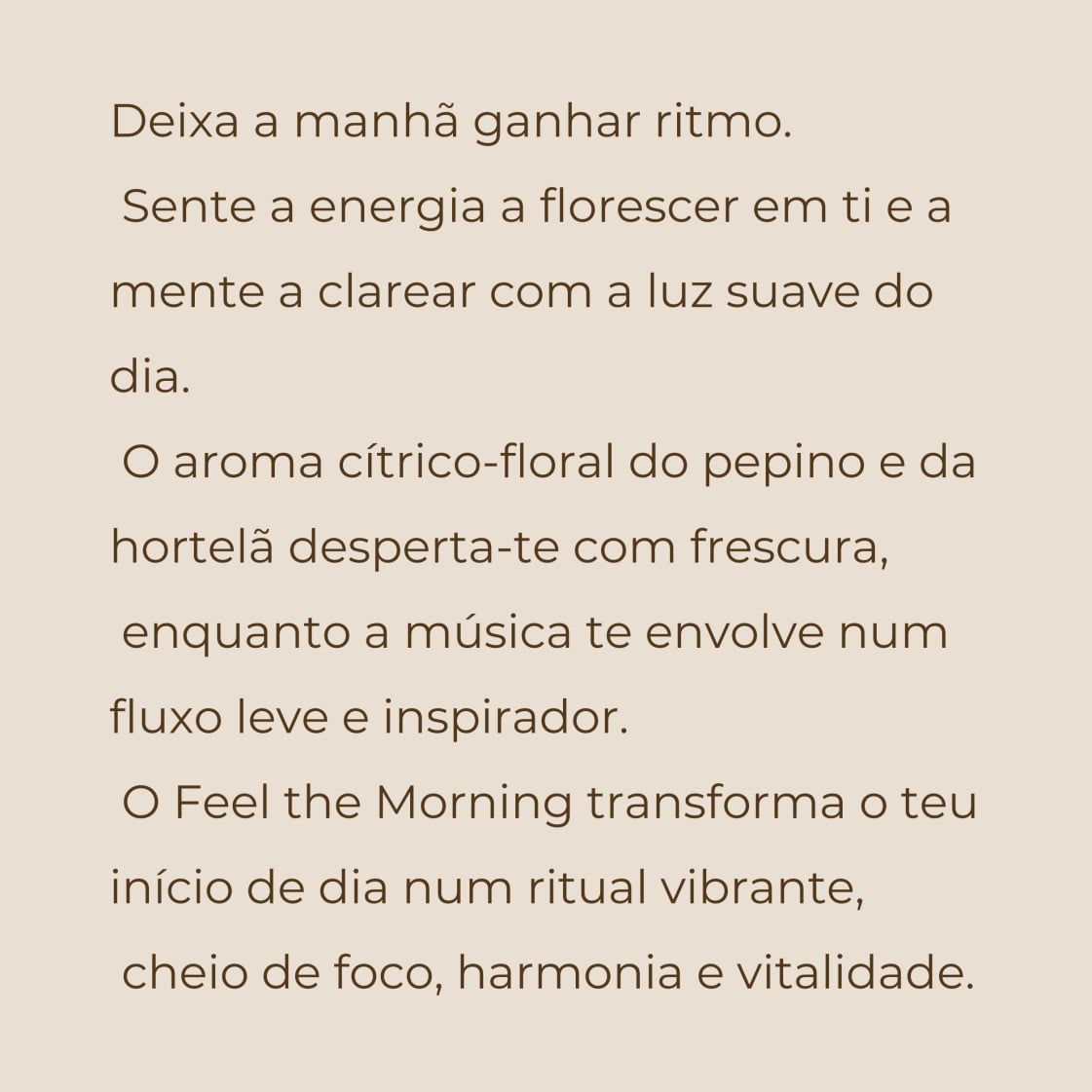 “Desde que comecei o meu ritual Feel the Morning, as minhas manhãs tornaram-se leves e luminosas, o aroma é fresco, inspira foco e a música completa o meu equilíbrio.”